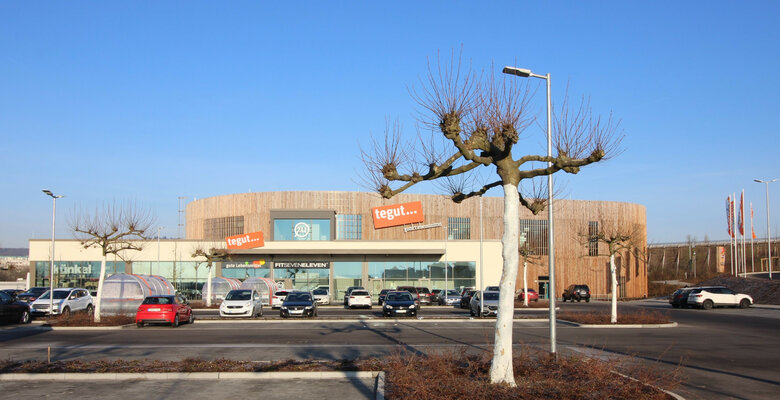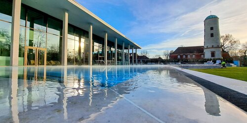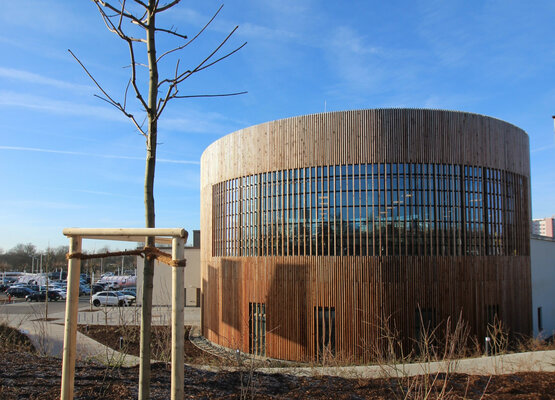 In unmittelbarer Nähe zu zwei historischen Gradierwerken mit Windmühlenturm wurde mit dem prägnanten Solitär ein neues Entree zur Kurstadt realisiert. Als Referenz zum Ort wurde der gerundete, am Kreisel zweigeschossige Bau mit Blockleisten aus Douglasie verkleidet – auch über die Fenster des Fitness-Studios hinweg, um die geschwungene Fassade plastisch nachzuformen. So werden beim Training Ausblicke auf die Gradierwerke freigegeben und bei Dunkelheit überrascht ein bizarres Erscheinungsbild.