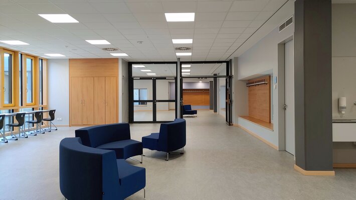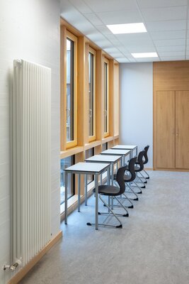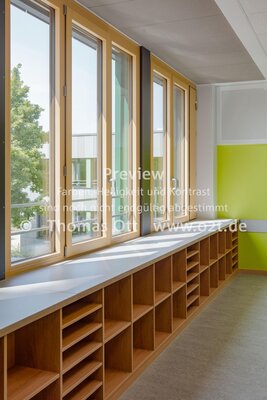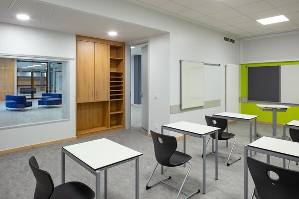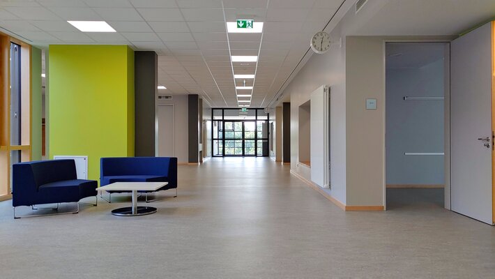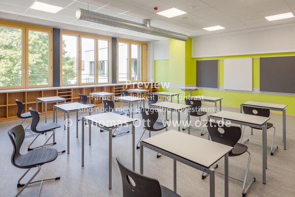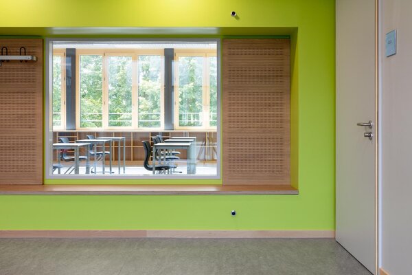 Der Bau wurde bei laufendem Betrieb saniert und in eine zeitgemäße Lernlandschaft mit Mensa verwandelt. Die acht Nutzungseinheiten beinhalten mehrere Klassenzimmer, die über Sichtfenster zum innenliegenden Flur- und Aufenthaltsbereich optisch miteinander verbunden sind und Unterricht in Clustern ermöglichen. Die aufgeweitete, interne Erschließungsachse schafft reizvolle Sichtbezüge und grenzt an eine lichtdurchflutete Aula. Dank neuer Fassade und Gebäudetechnik wird Passivhaus-Standard erreicht.