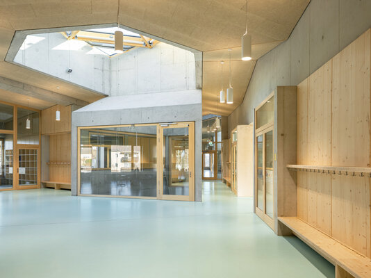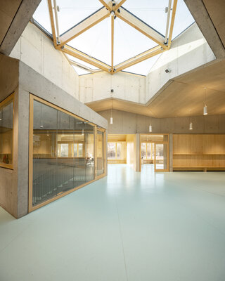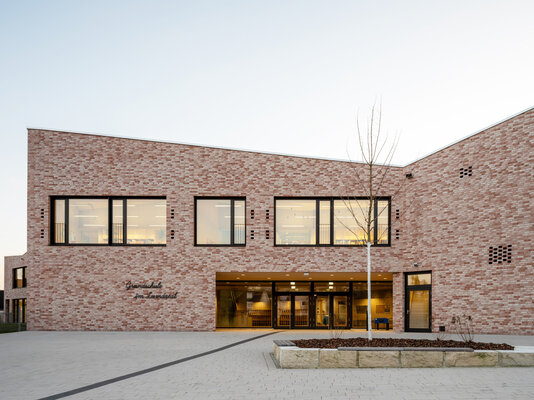 In der neuen, zentralen Grundschule im Lumdatal werden drei Ortsteilschulen der Stadt Staufenberg zusammengeführt. Der polygonale Baukörper reagiert auf die Grundstücksfigur und gliedert den umgebenden Freiraum. Die charakteristische Form entsteht aus der Aneinanderreihung von drei Fünfecken, die im Inneren drei Cluster als identitätsstiftende, überschaubare Bereiche bilden. Das auf besondere Weise gefaltete Dach verbindet diese Bereiche zu einer die Schule durchfließenden Lernlandschaft.