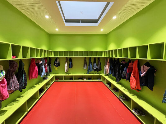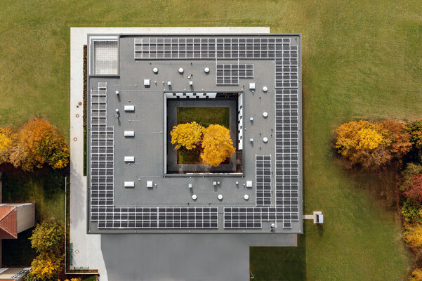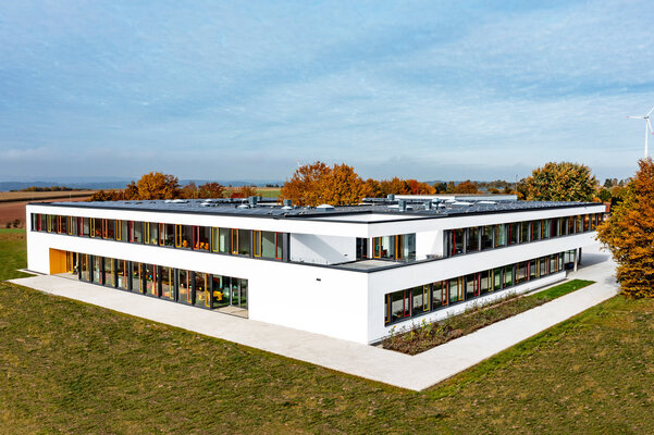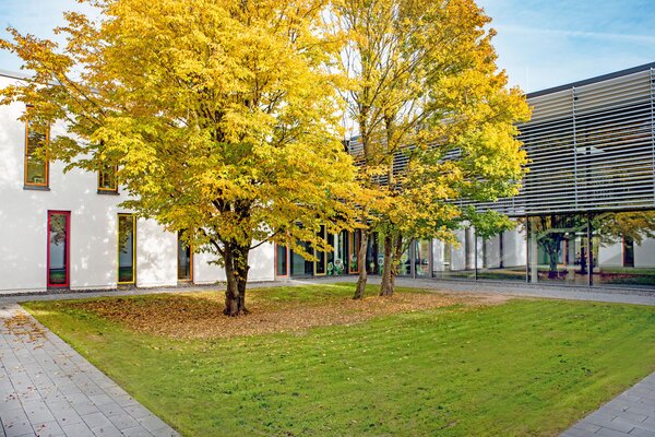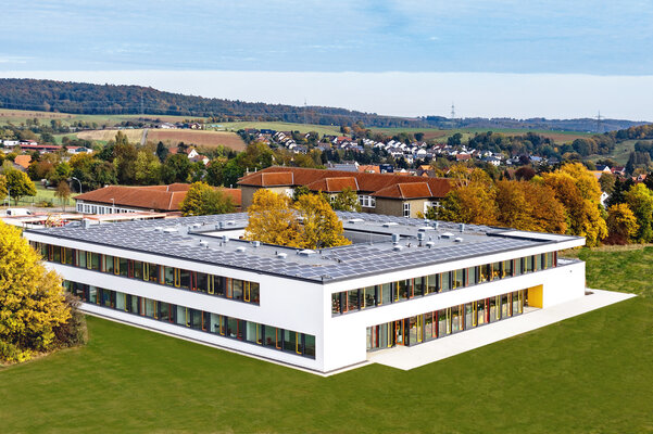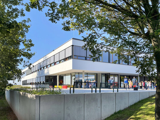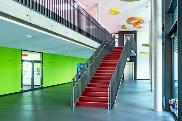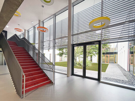 Der 2-geschossige Atriumtyp des Neubaus bildet eine kompakte und wirtschaftl. Gesamtfigur mit dem bestehenden Schulensemble. Alle Raumgruppen sind klar strukturiert und übersichtlich angeordnet. Der geometrische Baukörper wird durch Rücksprünge in der Fassade und Arkaden im EG funktional und gestalterisch strukturiert. Raumprägend ist, neben optimaler Belichtung aller Aufenthaltsräume, ein spannungsvolles Erschließungssystem mit Aufweitungen zum Innenhof und großzügigen Kommunikationsbereichen.