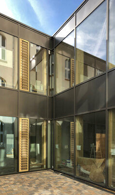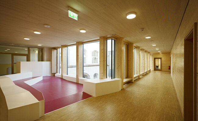 Das Gebäude ist komplett aus Holz konstruiert, auch die Oberflächen im Neubau sind größtenteils sichtbar in Holz ausgeführt.