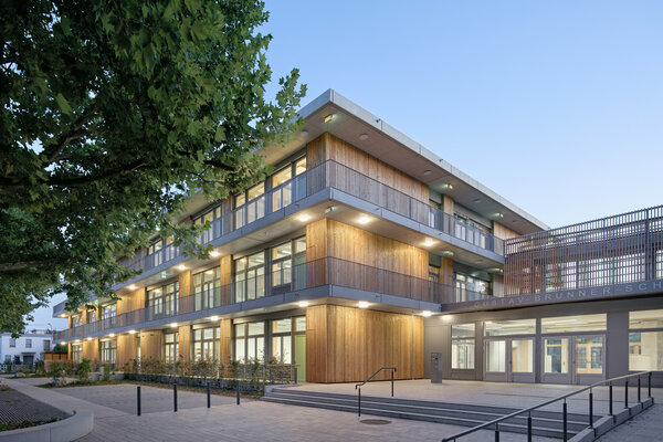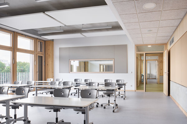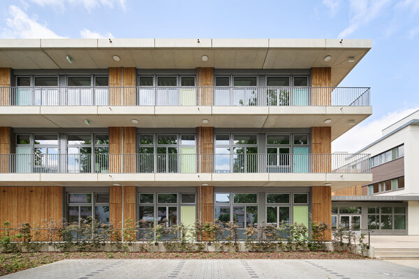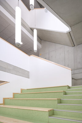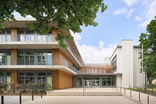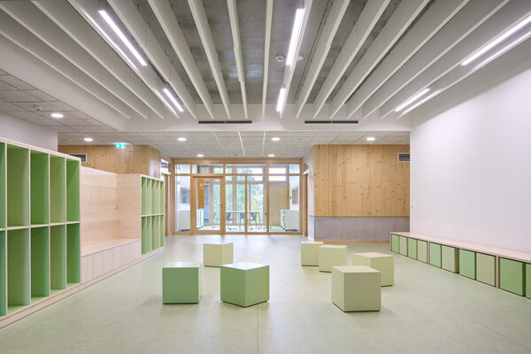 Der dreigeschossige Cluster-Grundschul-Neubau bildet mit dem modernisierten Bestandsgebäude das Ensemble der Ganztagsschule. Offene Raumzusammenhänge von Aula, Mensa und Schulhof bieten Raum für Austausch und Miteinander. Jahrgangscluster mit flexiblen Lernlandschaften fördern moderne Pädagogik. Sichtbare Holzoberflächen der Hybridbauweise prägen eine natürliche Atmosphäre und ein gutes Raumklima. Ein nachhaltiger Ort des Lernens, an dem sich Architektur und Pädagogik verbinden.