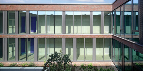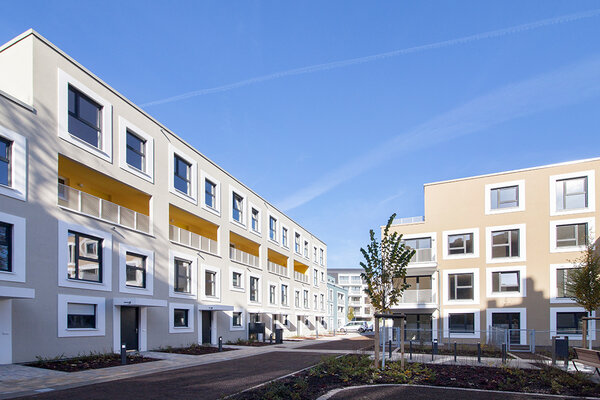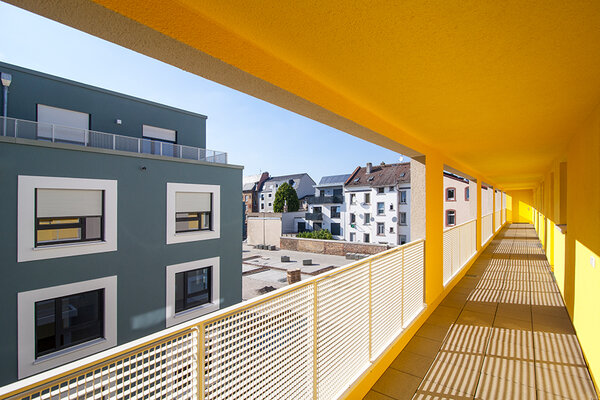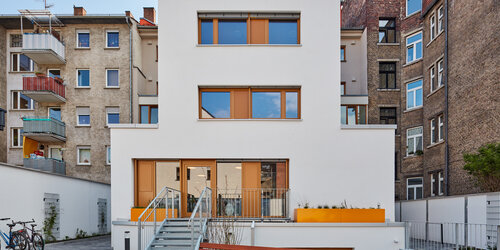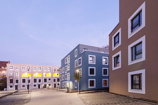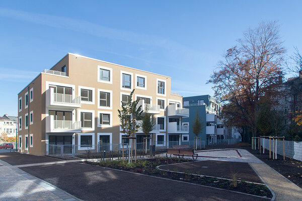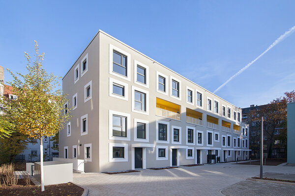 Mit seiner prägnanten Farbgestaltung bildet das Ensemble aus 6 Häusern ein lebendiges Wohnquartier aus 70 Wohnungen (1-Zimmer bis Familienmaisonette) auf einer ehemals versiegelten Brache mit altem Baumbestand im Innenhof eines geschlossenen gründerzeitlichen Straßenblocks. Die markanten Faschen der Fassaden wirken identitätsstiftend und nehmen Bezug auf die Umgebung. Wohngesundes Klima entsteht durch die nachhaltige Konstruktion aus hochwärmedämmendem Ziegelmauerwerk mit mineralischem Dämmputz.