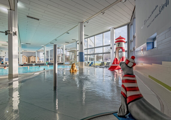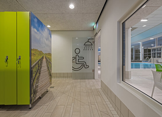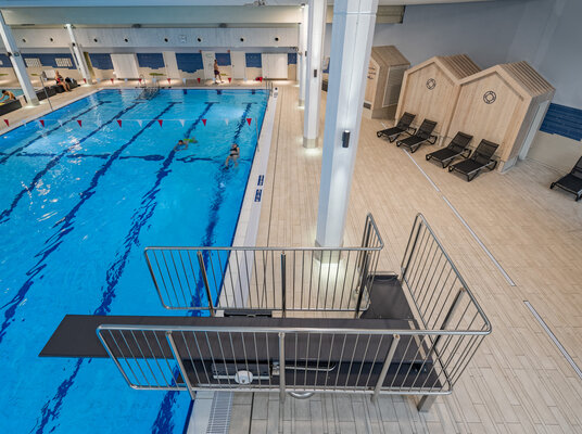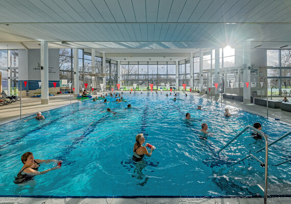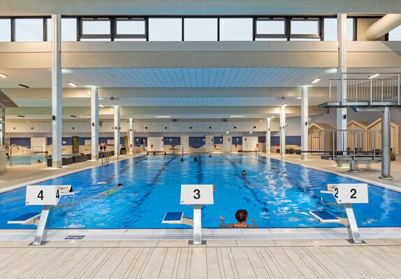 Umbau, Neustrukturierung und Komplettsanierung des Hallenbades einschl. Becken, Umkleide, Sanitär und Außenanlagen. Kompletterneuerung der haus- und badewassertechnischen Anlagen.