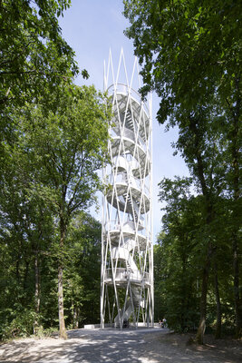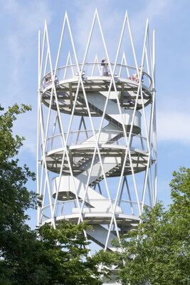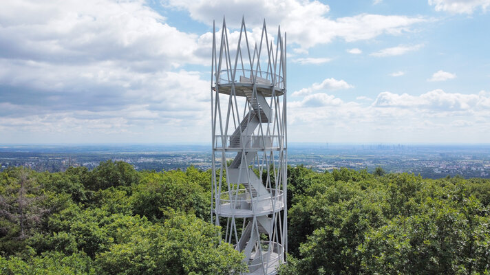 Auf dem 409 Meter hohen Hardtberg bietet der Hardtbergturm mit seiner Aussichtsplattform in 26,60 Metern Höhe Weitblick über Baumwipfel, den Taunus, die Rhein-Main-Ebene bis in den Schwarzwald. Durch seinen elliptischen Grundriss, die vier Erkundungsebenen und Aussichtsplattform, den wechselnden zweiläufigen Treppen mit 140 Stufen und der markanten, leichten Stahlkonstruktion wird der Turm zum Erlebnisraum. Die diagonalen, über die Plattform hinausragenden Stäbe setzen ihm eine weithin sichtbare Krone auf.