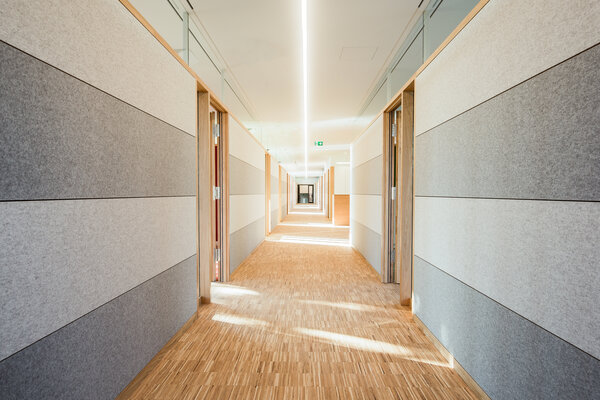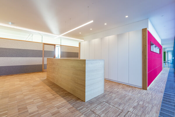 Um die Büroflächen des international agierenden Unternehmens an die Kapazitäten des Standortes anzupassen, wird die bestehende Lagerhalle aufgestockt und durch einen neuen Kopfbau sowie ein neues, als Baukörper vorgelagertes Treppenhaus ergänzt. Es handelt sich um eine eingeschossige Aufstockung aus Stahl und Holz auf ein industrielles Bestandsgebäude. Der Innenausbau erfolgt mit einheimischen Materialien: Eiche + Filz. Der Filz setzt farbliche Akzente und erzeugt eine besondere Raumakustik.