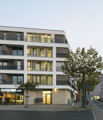 Der winkelförmige Baukörper des Wohn- und Geschäftshauses befindet sich vis-à-vis des Bahnhofsgebäudes und bildet eine klare städtebauliche Raumkante zum Europaplatz. Zwei Gastronomiebetriebe im Erdgeschoss beleben das Viertel. In den oberen Etagen befinden sich Appartements mit privaten Loggien zum Platz. Sie zeigen sich nach außen in wabenartigen Fassadenmodulen, die durch Vor- und Rücksprünge der Fassade Tiefe verleihen. Es entsteht ein Licht- Schatten-Spiel, das sich im Tagesverlauf verändert.