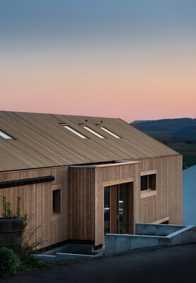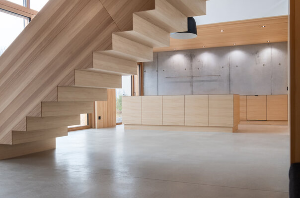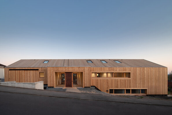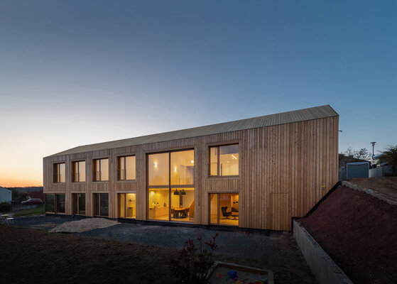 Das Wohnhaus der fünfköpfigen Bauherrenfamilie liegt am südlichen Hang des Florenbergs. Es nimmt als Holzbau Bezug auf die regionaltypischen Bauweisen der Rhön und erinnert in seiner langgestreckten Form und dem Satteldach eher an eine Scheune als an ein Wohnhaus. Beim Eintritt in das Haus öffnet sich dem Besucher über das zweigeschossige Fenster der Blick nach Süden. Viel Holz und Beton sowie fließende vertikale und horizontale Raumbeziehungen charakterisieren den Innenbereich.