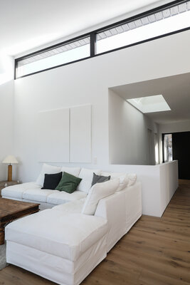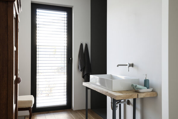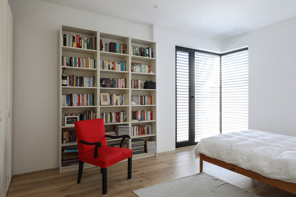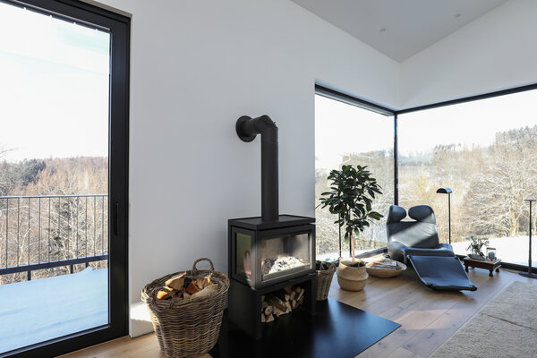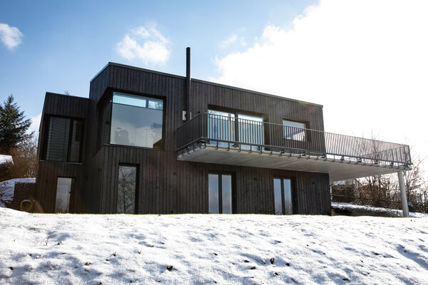 Das Grundstück am Hang eröffnet eine atemberaubende Aussicht in den Wald. Das Untergeschoss ist massiv ausgebildet und zur Hälfte unterirdisch gelagert. Das Obergeschoss wurde komplett in einer Holzständerkonstruktion umgesetzt und gliedert sich in drei Bereiche. Der großzügige und offene Wohnbereich befindet sich zum Garten ausgerichtet unter dem Pultdach. Der private Teil in der Mitte trägt ein Flachdach und das Garagendach wurde mit Wildkräutern und Gräsern bepflanzt. Die Fassade ist aus schwarz geflammten Holz.