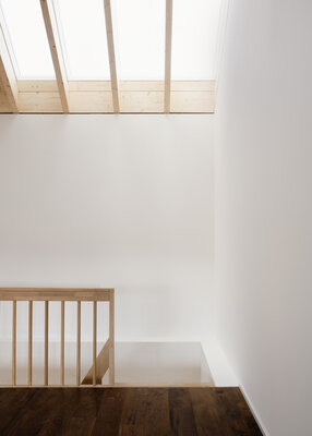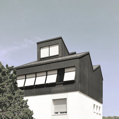 Durch die Aufstockung wird der Wohnraum des bestehenden Hauses um ein Elternschlafzimmer, Studio/Arbeitsbereich, Bad und ein Kinderzimmer erweitert. So können die Bedarfe der nun fünfköpfigen Familie vollumfänglich bedient werden. Als Konstruktionsweise wurde ein mit Karbonholz verschalter Holzständerbau gewählt. Der Baukörper erhält nach Süden hin eine breite Verglasung. Nach Norden wird über ein großzügiges Doppelfenster belichtet. Treppenraum und Empore werden über Lichtbänder im Dach erhellt.