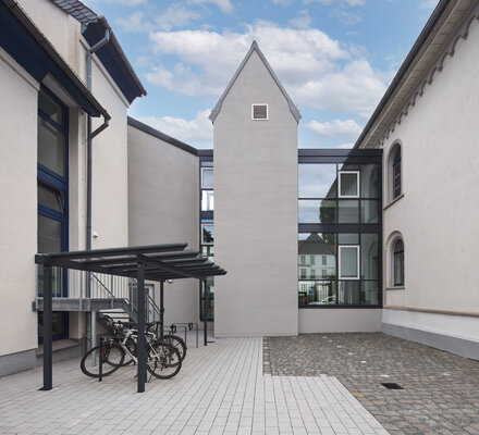 Der Gebäudekomplex „Haus Friedberg“ in der Friedberger Altstadt besteht aus dem historischen Altbau, erbaut im Jahr 1837 und einem Neubau aus den Jahr 1979. Aufgrund einer Neukonzeption der Gebäudenutzung musste das bestehende Evangelische Haus Friedberg weiterentwickelt und erweitert werden. Um diesen neuen Anforderungen gerecht zu werden, wurde ein neuer Eingangsbereich in Form eines Verbindungsgebäudes konzipiert, welcher die bestehenden Nutzungsebenen barrierefrei verbindet.