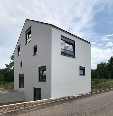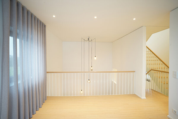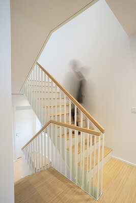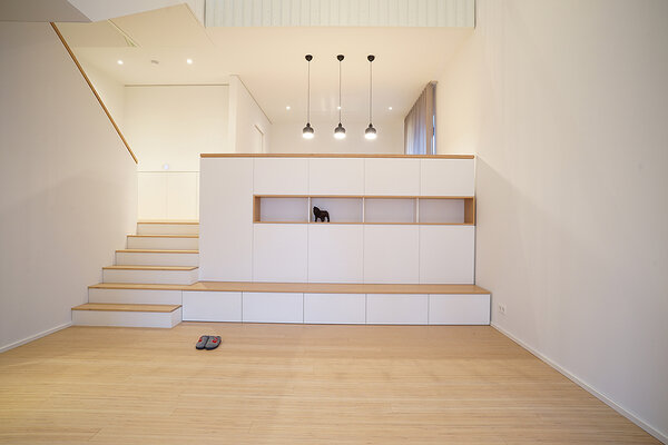 Das Gebäude und seine Räume werden maßgeblich über Split-Level gestaltet. Das Sitzfenster der Galerie im Obergeschoss er-möglicht es, das natürliche Licht tief in das Gebäude dringen zu lassen und den Wohn-Ess-Bereich über einen Luftraum natürlich zu belichten. Die reduzierte An-mutung der spielerisch gestalteten Fassade findet sich gleichermaßen im Inneren des Gebäudes wieder. Durch die von den Architekten geplanten Einbauten wird das Raumgefüge unterstrichen und bildet ein stimmiges Gesamtbild.