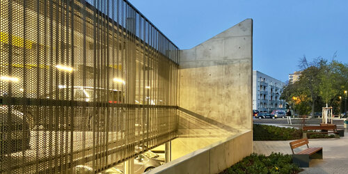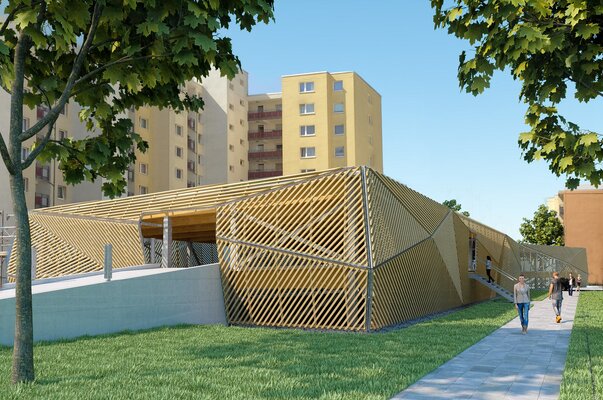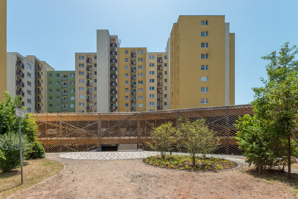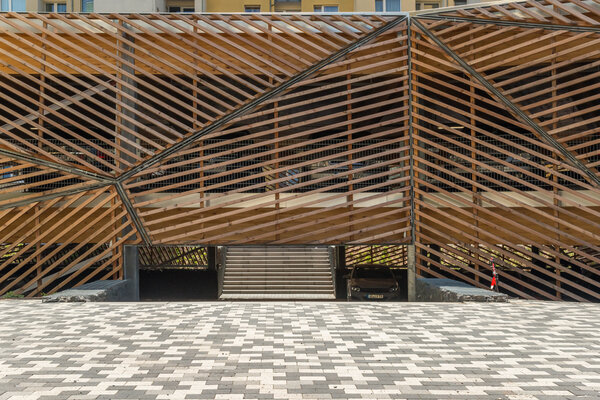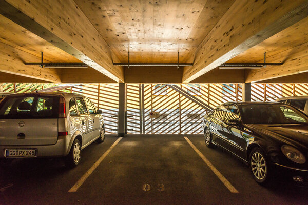In der Großwohnsiedlung „Dicker Busch“ aus den 1970er Jahren in Rüsselsheim entsteht ein Parkhaus, welches sich vor allem mit den Begriffen Innovation, Ökologie und Nachhaltigkeit identifizieren kann. Erstmalig in Deutschland wird ein Parkhaus realisiert, bei dem sowohl die Parkebenen als auch die Decken-träger aus dem nachwachsenden Baustoff Holz konstruiert sind. Durch die nachhaltige Konstruktion werden ca. 8,5 cbm Beton und ca. 1,25 t Stahl pro Stell-platz eingespart.