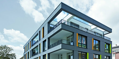 Massiver Natursteinsockel mit aufgehender Holzfassade. Teil des Ensembles "Musikquartier" am Bahnhof in Kronberg. Hochwertige Architektur mit edlen Materialien auf wirtschaftlichen Grundrissen.