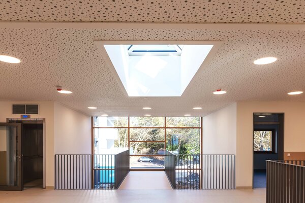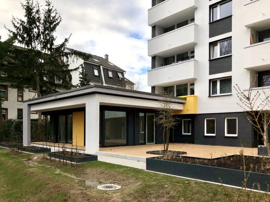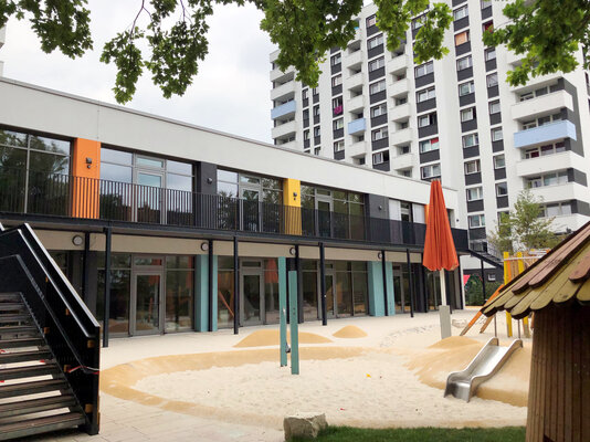 Im Zuge des Masterplans für die Quartierssanierung „Im Mainfeld“ wurden an zwei der insgesamt 6 Wohnhochhäuser, Neubauten errichtet die gemeinsam das Kinder- und Familienzentrum bilden. Sowohl die zweigeschossige KITA mit 5 Gruppenräumen in Passivhausstandard als auch das eingeschossige Begegnungszentrum mit Familien-Café nutzen jeweils die Erdgeschossflächen der Wohnhochhäuser mit und tragen somit zu einer Bereicherung des sozialen- und familiären Umfelds der gesamten Siedlung bei.