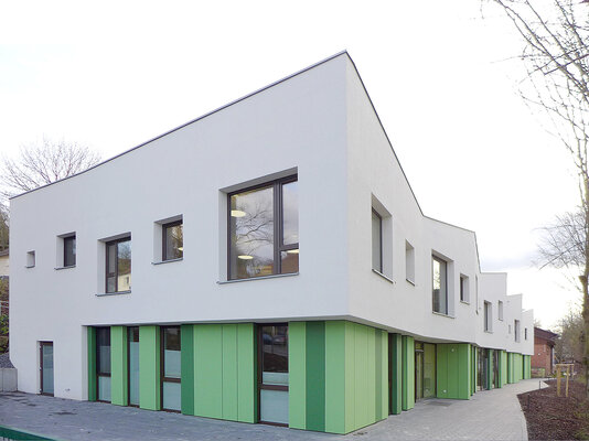 Ziel war es, den zweigeschossigen Kindergarten in das hängige Grundstück einzufügen und räumliche Verknüpfungen zu den Einrichtungen der ev. Kirchen-gemeinde herzustellen. Die gefaltete Dachfläche gliedert den Baukörper an seinen Längsfassaden und vermittelt in der Maßstäblichkeit zu