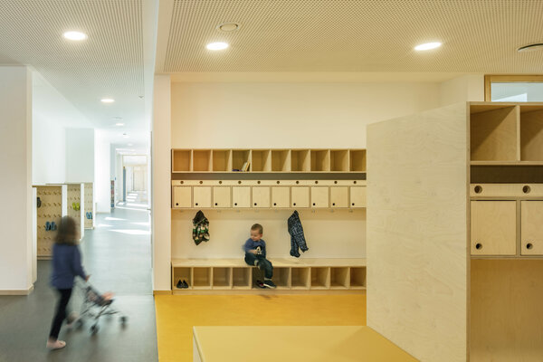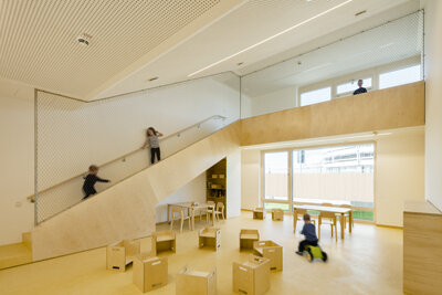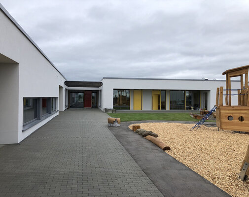Der Neubau für die eingeschossige Kindertagesstätte fügt sich wohltuend in die Umgebung ein und vernetzt sich räumlich mit den Außenanlagen. Unverkennbar sind die höher liegenden Spielebenen der jeweiligen Gruppenräume, die den Kindern neuen Raum für unzählige Spielideen bieten. Das Gebäude wird durch den mittig liegenden Haupteingang in den öffentlichen und nicht öffentlichen Bereiche gegliedert. Jedem Gruppenraum wird ein kleiner Garten zugeordnet, der ebenerdig zugänglich ist.