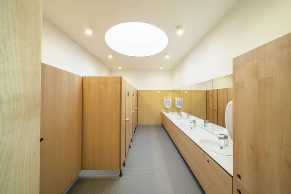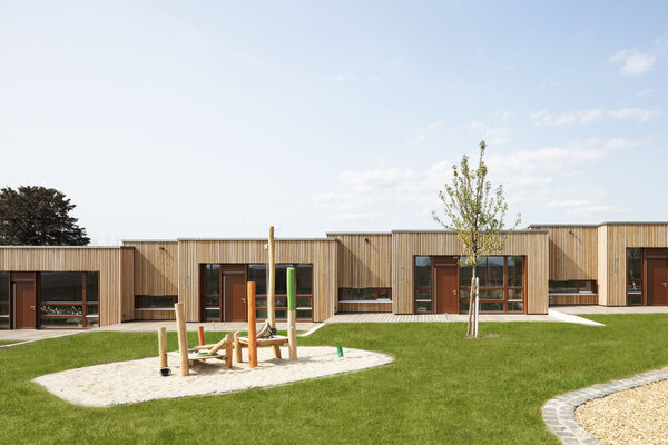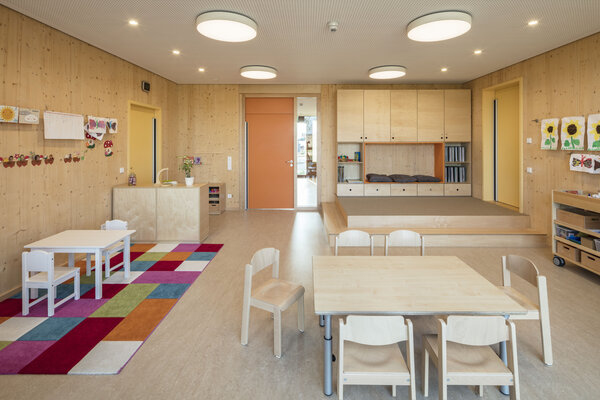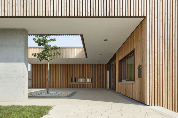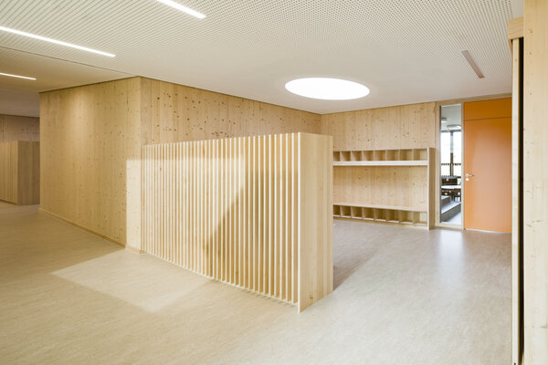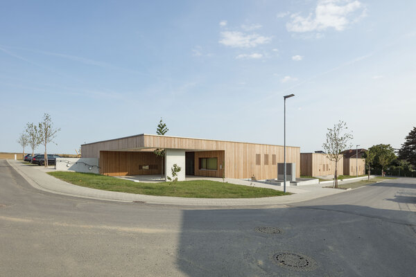 Der langgestreckte eingeschossige Baukörper bildet den Abschluss des Wohngebietes und den Übergang zur weitläufigen Flur. Über einen großzügigen überdachten Vorplatz mit einem Baum, der durch das Dach wächst, erreicht man den Eingang. Die höhengestaffelten Einzelvolumina der Gruppeneinheiten treppen sich mit dem Hang ab. Auch im Inneren folgt der Flurbereich über Rampen der Topografie. Sichtholzflächen prägen die Atmosphäre – die Licht- und Farbstimmung ist hell, natürlich und warm.