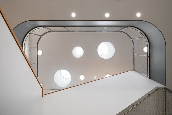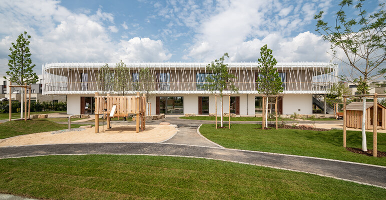 Mit Bezug auf städtebauliche und architektonische Leitlinien wurde für das Kinderzentrum im Quartier Riedberg eine freie, zweigeschossige Gebäudeform entwickelt. Der dreiseitig auskragende Balkon und das auskragende Dach verstärken den pavillionartigen Charakter des Gebäudes. In Erd- und Obergeschoss befinden sich jeweils drei, Richtung Garten und Spiellandschaft ausgerichtete Gruppenräume. Die Räume im OG sind über den Balkon und zwei seitlich angeordnete Treppen an den Freiraum angeschlossen.
