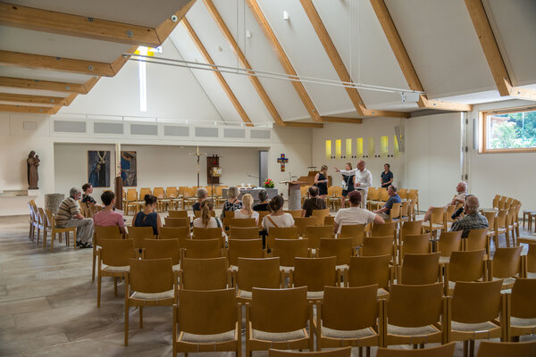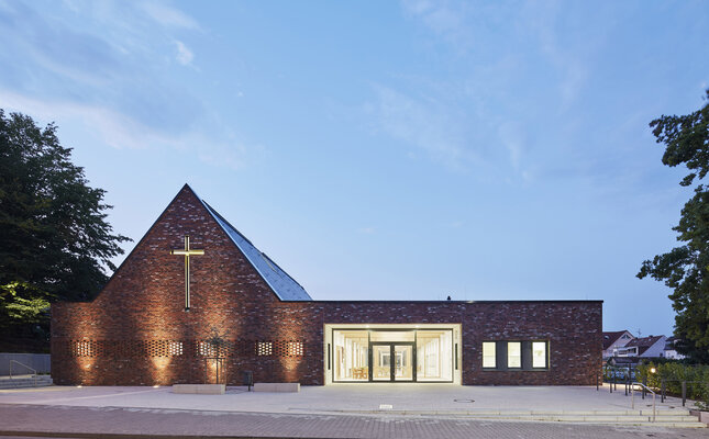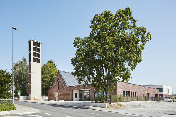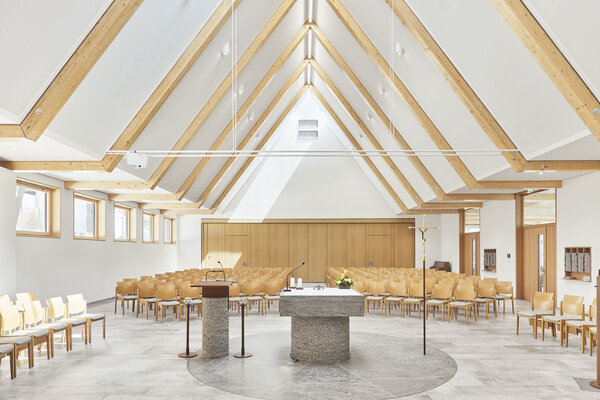 Das aus den 1960er Jahren stammende Gemeindezentrum genügte technisch, gestalterisch und funktional nicht mehr den Anforderungen an ein modernes Gemeindeleben. Der eingeschossige Neubau von Kirche und Gemeindezentrum ist um ein zentrales, alle Nutzungen verbindendes Foyer organisiert, das vor, während und nach den Gottesdiensten und Veranstaltungen als informeller Treffpunkt dient. Der Kirchenraum kann nach Bedarf von 30-40 auf bis zu 350 Sitzplätze erweitert werden.