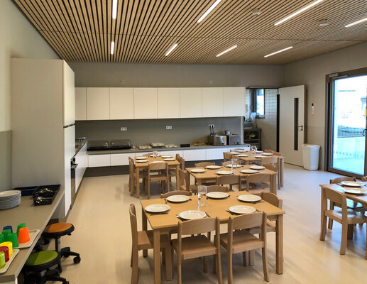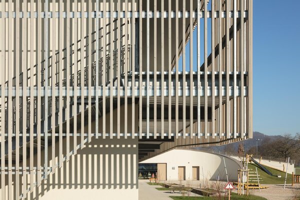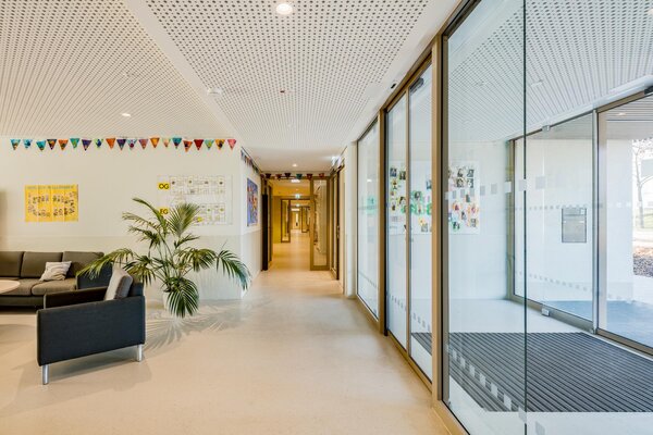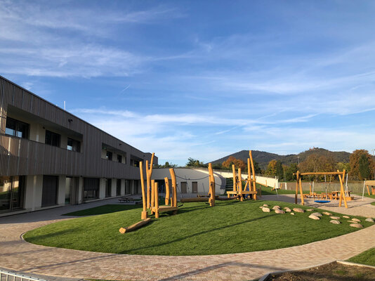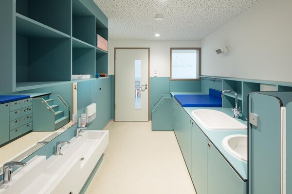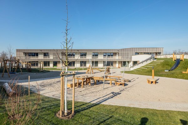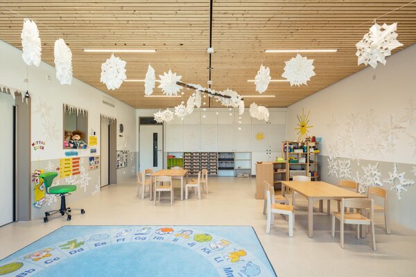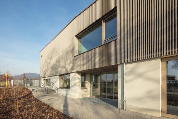 135 Kinder U3/ Ü3, sieben Gruppen, teils Mehrfachnutzung der Räumlichkeiten durch Vereine etc.: Diese Anforderungen führten auf dem gut 3.700 Quadratmeter großen Grundstück zu einem kompakten, langgestreckten Riegel, der den südlichen Außenbereich zur lauten Verkehrsstraße hin abschottet. Eine zeitgemäße Gebäudetechnik (mit sommerlicher Kühlung und eigener Solarstromproduktion), die Geländemodulation (Spielhügel und zweiter Rettungsweg zugleich) und eine gute Raumakustik zählen unter anderem zu seinen Besonderheiten.