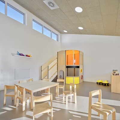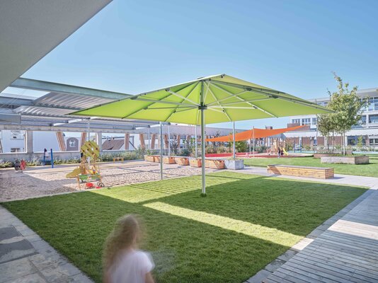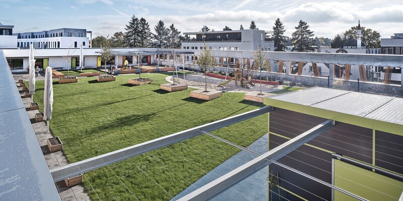 Am zentralen Quartiersplatz liegt im neuen Wohnquartier Vickersareal der Nahversorger (tegut) und 6-gruppiger KiTa und großzügigem Dachspielfeld on top. Das Gebäude ist Teil der schallschützenden Blockrandbebauung. Über einen Treppenturm gelangt man in die KiTa für 124 Kinder im Alter von 6 Monaten bis 10 Jahren. Eine Besonderheit ist das Dachspielfeld über dem Nahversorger und seinen Parkplätzen im EG. Die charakteristischen Holzlamellen sind Teil des Konzepts zur Fassadenbegrünung.