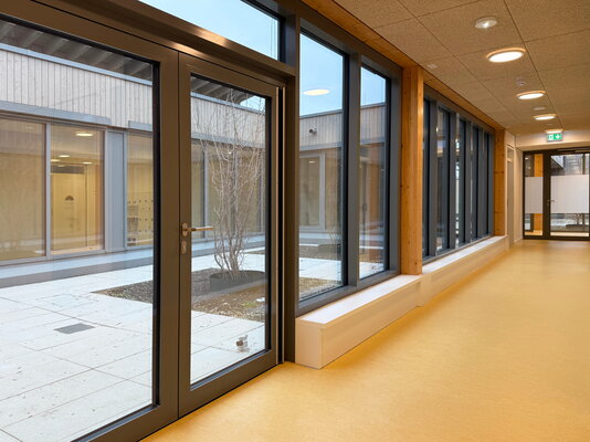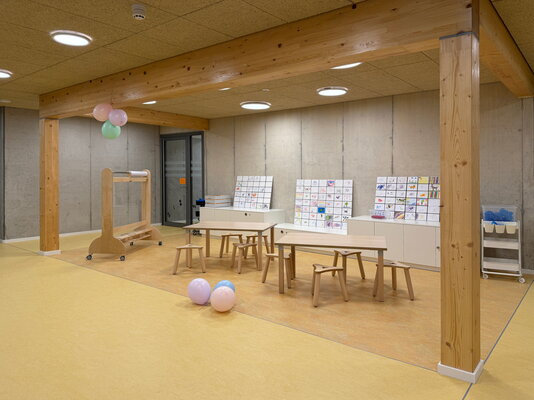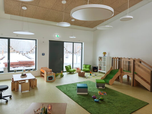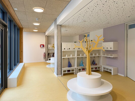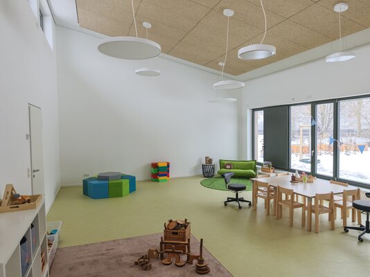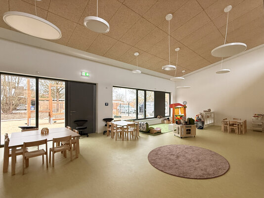 Die eingeschossige, sechszügige Kita positioniert sich mit zwei klar strukturierten Baukörpern, die über einen Zwischenbau miteinander verbunden sind und eine klare Zonierung des Grundstücks schaffen. Mit der gewählten Gebäudetypologie wird eine klar lesbare Raumorganisation angeboten, die eine leichte Orientierung bei vielfältiger Nutzungsoption ermöglicht. Eine Holzhybridkonstruktion bildet das Tragwerk, mit Fokus auf Flexibilität, Zuverlässigkeit, Wirtschaftlichkeit und Nachhaltigkeit.