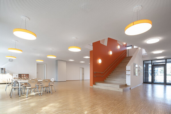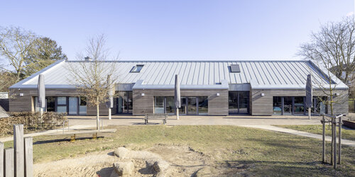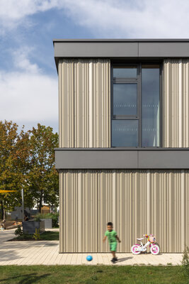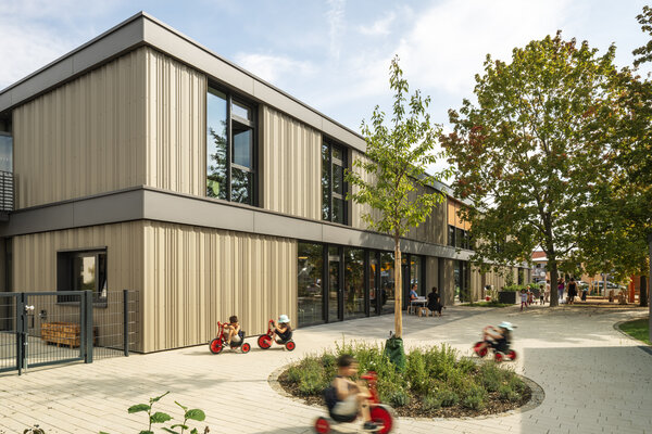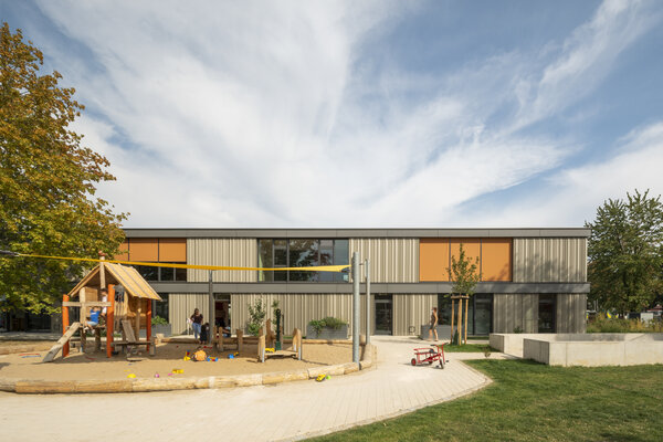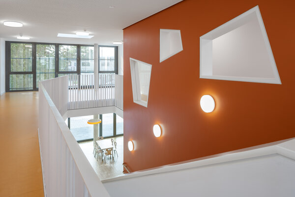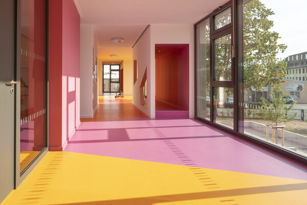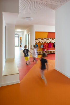 Der Kita-Grundriss ist entwickelt aus einer Komposition „geschlossener Raumvolumen“ für Nebenräume und offener, transparenter Gruppenräume und Bewegungsflächen. So entstehen differenzierte Raumqualitäten und fließende Übergänge in den Freiraum. Die Fassade besteht aus gefaltetem Alublech, das in Teilbereichen als gelochtes Blech einen feinen Filter vor dem Fenster bildet. Im Spielflur sind Raumbezüge und Lichteinfall durch die Farbgestaltung von Wand und Boden akzentuiert.