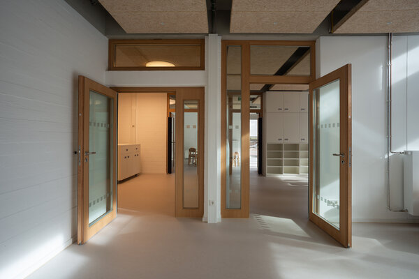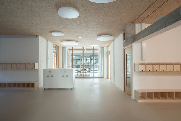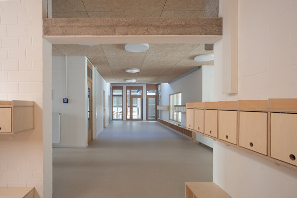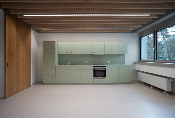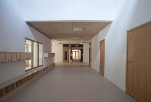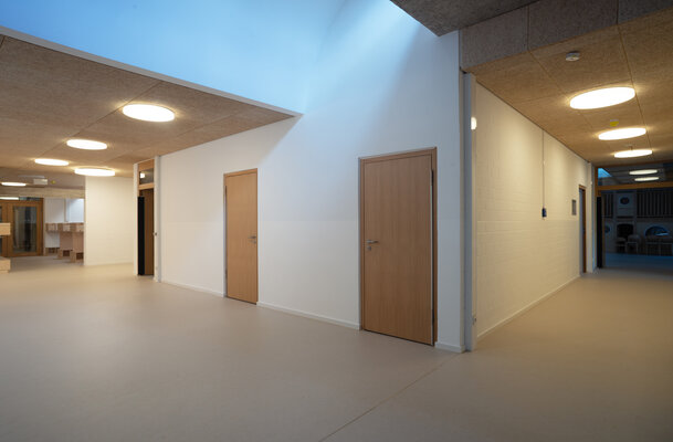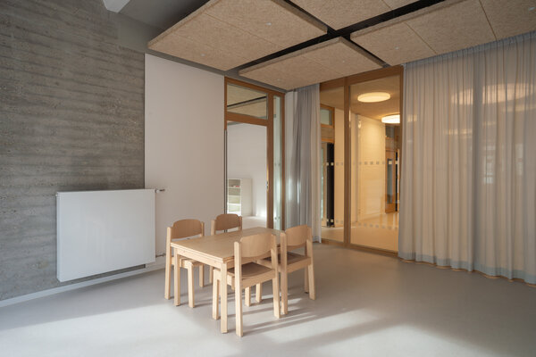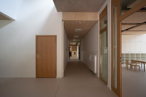 Der Fokus der innenräumlichen Modernisierung lag darauf, die aktuellen räumlichen, funktionalen und technischen Anforderungen sensibel in den Bestand aus den 1970er- Jahren zu integrieren und gleichzeitig den bauzeitlichen Charakter in Struktur und Materialität zu bewahren. Durch die Verbesserung der Orientierung und der natürlichen Belichtung mittels neuer Sichtbeziehungen sowie „Lichtschaufeln“ in den Oberlichtern wird das Zuhause der Kita weiterentwickelt und langfristig zukunftsfähig gemacht.