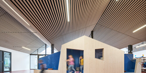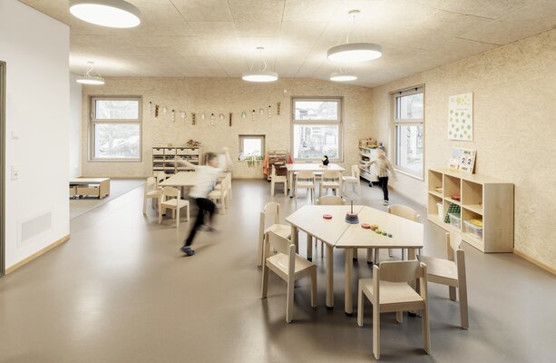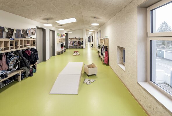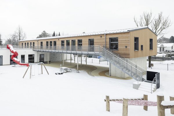 Im Erdgeschoss ergibt sich so ein überdeckter Spielbereich. Das Dachspielfeld auf dem eingeschossigen Gebäudeteil vergrößert den Freibereich auf 1.500 m2.