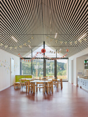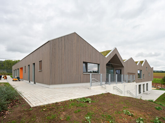 Die Kita Sausewind beherbergt auf zwei Etagen zwei Krippen- und vier Kitagruppen. Die starke Hanglange ermöglicht den ebenerdigen Zugang in die Außenspielbereiche aus beiden Etagen. Großzügige Spielflure verbinden beide Etagen mit Foyer und Speiseraum. Die Gebäudeform wird von der bewegten Dachlandschaft geprägt, die auch im Inneren raumprägend wirkt. Der kompakte Baukörper besteht aus einer Holzkonstruktion mit begrünter Dachlandschaft über dem massiven Sockelgeschoss in Hangebene.