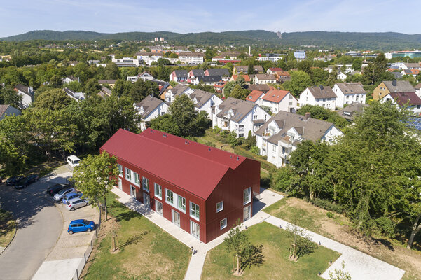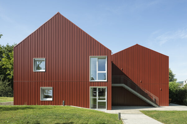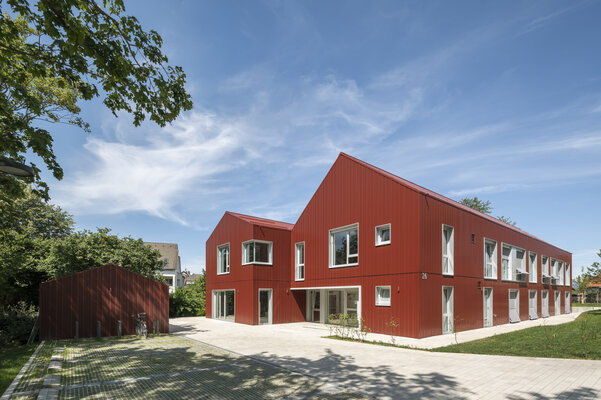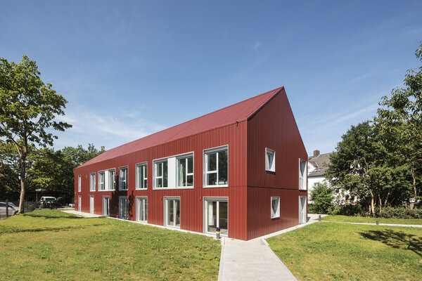 Die Kubatur des Hauses mit stationären Wohnangeboten für Menschen mit geistiger und mehrfacher Behinderung wird durch zwei markante Satteldächer gegliedert. Eine großzügige Wohnküche in der Nähe des Haupteingangs dient als Gemeinschaftsraum und bietet einen direkten Zugang zur Außenterrasse. Die dezentrale Be- und Entlüftung mit Wärmerückgewinnung sowie die Markisen bieten einen hohen Wohnkomfort. Die Gebäudehülle wird durch spezifisch für das Projekt profilierte Metalltafeln bestimmt.