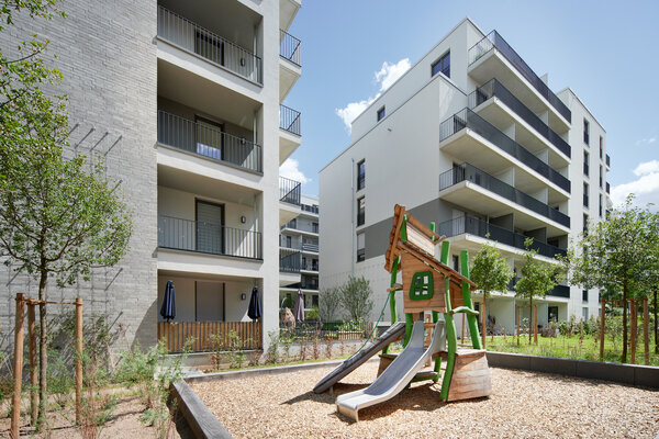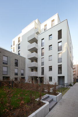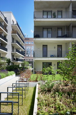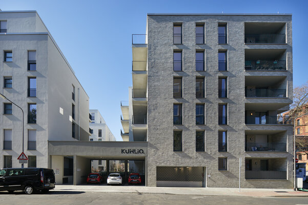 Ein Gebäudeensemble, das den vielfältigen Ansprüchen einer zeitgemäßen Wohnbebauung gerecht wird und dabei ein Höchstmaß an gestalterischer Qualität im urbanen Kontext bietet. Statt auf eine strenge Blockrandbebauung setzt der Entwurf auf die Maximierung von Licht und Luft. Die üppig begrünten Freianlagen, Gründächer und Innenhöfe erhöhen zudem den Wohnkomfort innerhalb des Quartiers und leisten einen positiven Beitrag zum Stadtklima. KUHliO erhielt dafür Deutschlands erstes GreenPass Zertifikat.