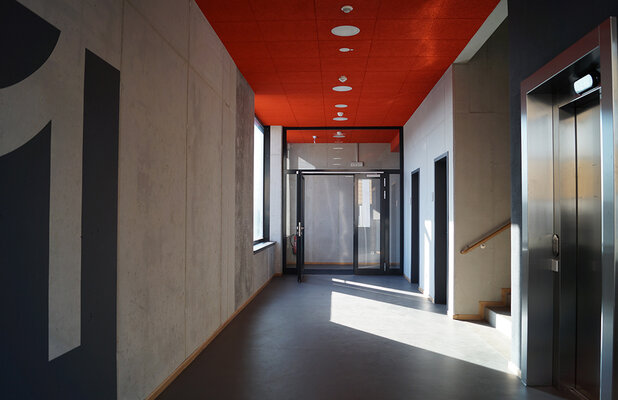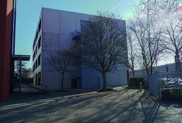 Als Reaktion auf extrem beengte Platzverhältnisse stapelt der Werkstatt-neubau einer gewerblich-technisch berufsbildenden Schule unterschiedlichste Lehrbereiche wie Kfz-Werkstatt, CNC-Labore und haustechnische Teststände in vier Geschossen übereinander. Außenfassade sowie Großteile der Innenwandflächen sind in Sichtbeton ausgeführt und bilden so einen robusten Rahmen für die handwerkliche Ausbildung. Durch die kompakte Bauform wurden langjährige Interimsunterbringungen vermieden.