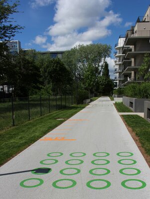Das Projekt ist Teil der begonnenen Stadtteilumwandlung der Bürostadt Niederrad und dient im Gesamtgefüge mit seinem „grünen“ Erscheinungsbild einer Belebung des Stadtteils. Das Gestaltungskonzept nahm die sich durch die städtebauliche Konfiguration ergebenden Freiräume auf und ordnete ihnen thematische und funktionale Schwerpunkte zu. Zwischen den beiden Solitärgebäuden im Westen wurde ein Quartiersplatz angelegt, der zwischen Aktiv- und Ruhezone vermittelt und als zentrale Mitte fungiert.