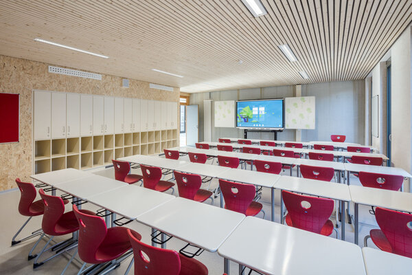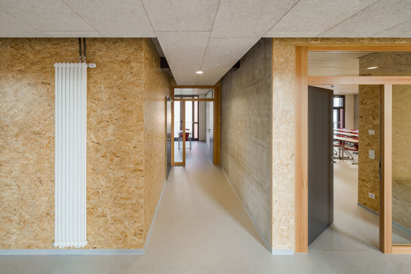 Der dreigeschossige Erweiterungsbau des Max-Planck-Gymnasiums wurde durch einen hohen Vorfertigungsgrad über eine kurze Bauzeit und geringe Belastung des Schulbetriebs erbaut. Die tragende Struktur besteht aus Stahlbetonhalbfertigteilwänden und Spannbetonhohldielen. Die Außenwandelemente sowie die Fassade bestehen aus vorgefertigten Holztafelelementen mit einer Vergrauungslasur. Der Neubau mit Satteldach ordnet sich der innerstädtischen Lage und dem denkmal-geschützten zentralen Schulbau unter.