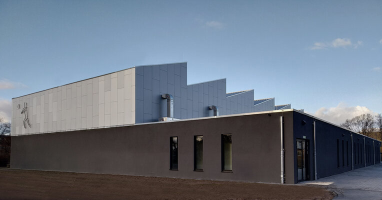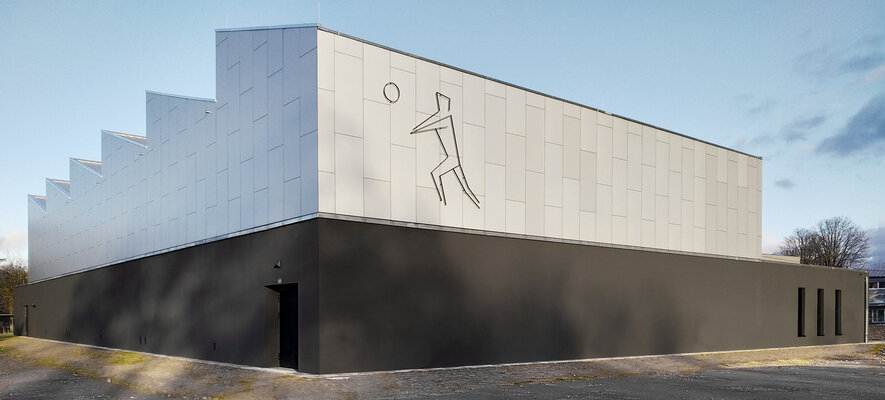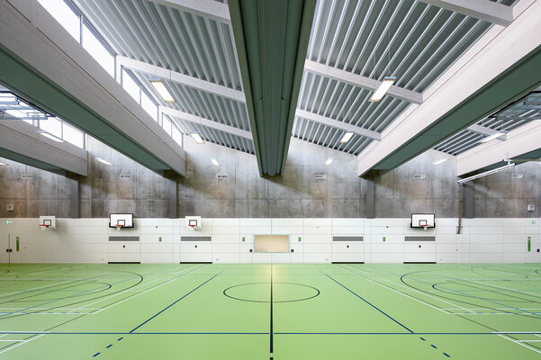 Die neue Zwei-Feld-Halle ist in Stahlbeton-Konstruktion errichtet worden. Das Gebäude hat einen „soliden Sockel“ als Stahlbeton-Konstruktion mit WDVS. Der obere Bereich der Halle ist als „leichte Krone“ mit einer hinter- lüfteten Fassade aus HPL-Tafeln hergestellt. Das Dach der Halle ist in einer Holzkon-struktion als Sheddach mit Stehfalzdeckung ausgeführt. Der Mehrzweckraum sowie die Nebenräume sind eingeschossig und mit einem Gründach aus-gebildet worden.