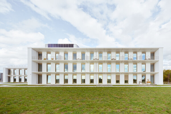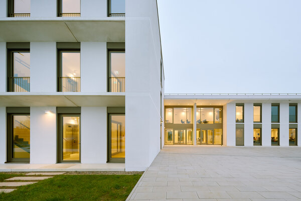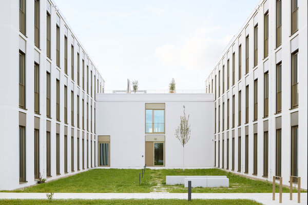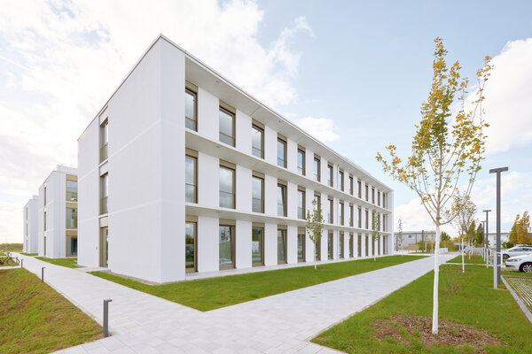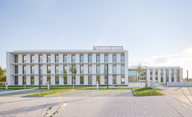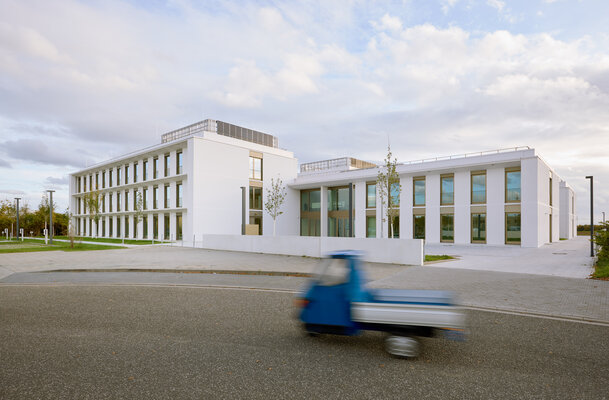 Klare Architektur trifft auf konsequentes Low-Tech und durchdachtes Nutzungskonzept. Flexibel teilbare und nur natürlich zu belüftende Büroflächen sowie S2-Labore gruppieren sich um die begrünten Höfe der Kammstruktur. Ein großer Konferenzbereich sowie ein integriertes medizinisches Boardinghaus ergänzen das Raumprogramm. Der verputzte monolithische Poroton-Mauerwerksbau kommt ohne zusätzliche Dämmung aus. Die Nutzung von Geothermie und Photovoltaik sorgt für nahezu autarke Energieversorgung.
