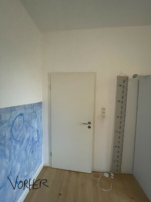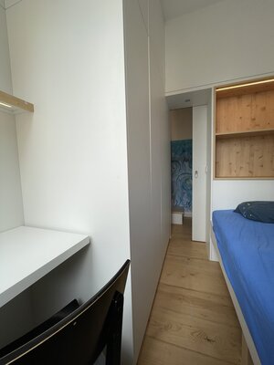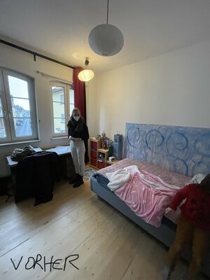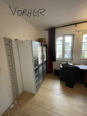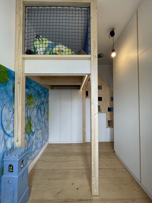 Um einen zusätzlichen Raum zu generieren, wurden von der Familie viele Möglichkeiten betrachtet. Es durfte nicht angebaut werden, Denkmalschutz. Selbst der Keller, mit großem baulichem und finanziellem Aufwand, wurde zur Not in Betracht gezogen. Die Innenarchitektin erarbeitete eine Lösung innerhalb des Kinderzimmers. Im Raum wurde durch geschickte Platzierung und Formung der Möbel ein zusätzlicher Rückzugsort, ein Zimmer geschaffen. Zu Beachten war die Revisionierbarkeit auf dem alten Parkett.