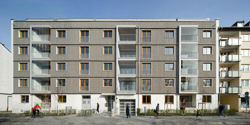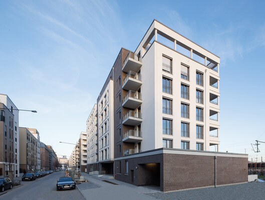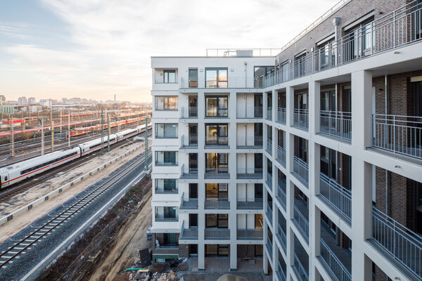 Der Wohnungsbaukomplex liegt in der Nähe des Frankfurter Hauptbahnhofs und in direkter Nachbarschaft zu den denkmalgeschützten Adlerwerken. Vor diesem Hintergrund wird besonderes Augenmerk auf die Themen Schallschutz und Denkmalpflege gelegt. Auf dem schmalen, langen Grundstück nehmen die 3 Baukörper die Form eines Mäanders auf, der als grünes Band auf den intensiv begrünten Dachgärten erlebbar wird. Sie schaffen hochwertige Auf-enthaltsbereiche und bieten einen freien Blick auf die Skyline.