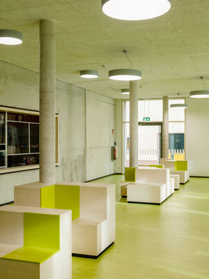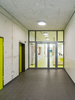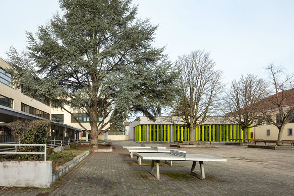 Der Neubau wurde am Standort der ehemaligen Pausen-WCs an der nördlichen Grundstücksgrenze errichtet, schließt die Gesamtanlage und bildet eine neue, sich zur Pausenfläche öffnende schulische Mitte. Das Gebäude bietet Platz für die Mittagsversorgung von 150 bis 200 Kindern, Küche, Schülerkiosk und WC. Es wird neben der Verpflegung auch als Aula und Aufenthaltsraum genutzt. Das Gebäude wurde in Hybridbauweise aus Stahlbeton-Tragwerk und vorelementierten Holzrahmenbau-Fassadenelementen gefertigt.