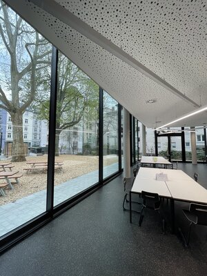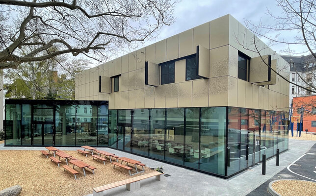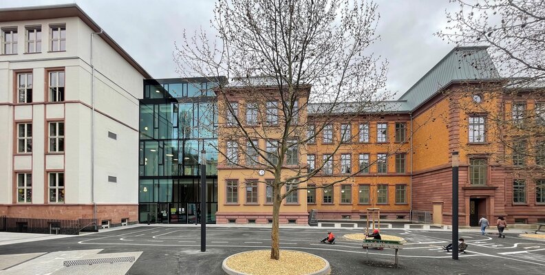 Die denkmalgeschützte Merianschule im Frankfurter Nordend wurde für Fünfzügigkeit, Inklusion und Ganztagsbetrieb umgebaut, kernsaniert und erweitert. Ein 4-geschossiger Teilneubau mit vorgehängter Glasfassade ermöglicht einen neuen Haupteingang vom Schulhof sowie hochwertige zusätzliche Aufenthaltsräume. Zur Essensversorgung wurde ein zweigeschossiger Mensaneubau auf dem Schulhof errichtet. Der Neubau fügt sich mit seiner individuellen Gebäudeform zwischen den erhalten gebliebenen Baumbestand.