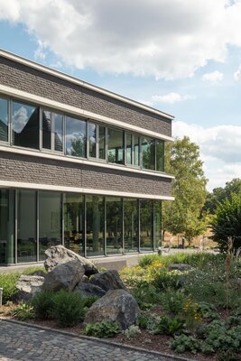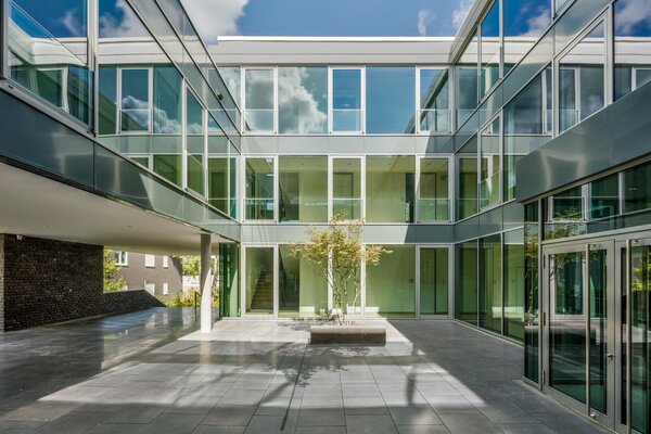 Der Neubau erweitert die Hauptverwaltung der MHI-Gruppe um ein repräsentatives, dreigeschossiges Atrium-Bürogebäude. Der in sich ruhende kubische Baukörper ordnet die heterogene städtebauliche Situation in klar gefasste Räume und schafft gleichzeitig einen Innenhof mit großem Identifikations-potenzial und hoher räumlicher Qualität. Unser Ent-wurfskonzept als Interpretation des Themas „Villa im Park“ wurde im Architektenwettbewerb mit dem 1. Preis ausgezeichnet.