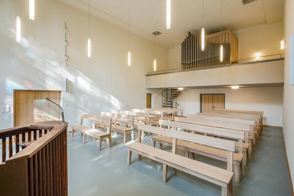 Während die Gestaltung der Außenfassade von einem bauzeittypischen abstrakten Mosaik über dem Eingang geprägt wird, dominiert ein großes farbiges Glasfenster an der Giebelfassade den Innenraum. Dieser wurde von HGP Architekten in Abstimmung mit der Denkmalpflege überarbeitet, farblich neu gefasst und mit beheizten Sitzbänken an die heutigen Bedürfnisse angepasst.