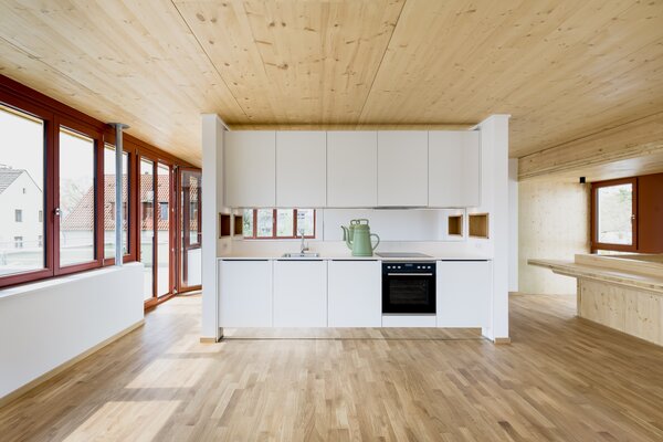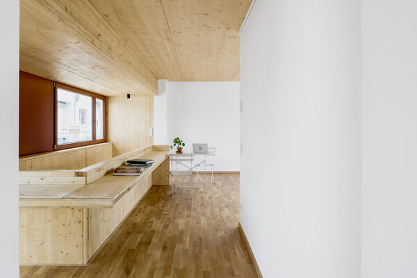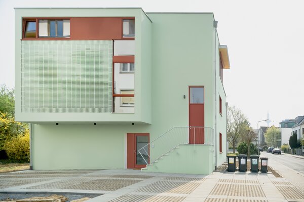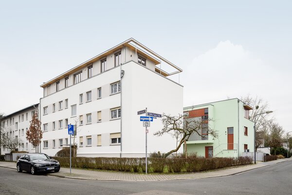 Dabei werden die Prinzipien des „Neuen Bauens“ in Frankfurt zeitgemäß interpretiert. Farbkonzept und Materialität nehmen Bezug auf die ursprüngliche Nutzung des Geländes als Gärtnerei – Neubau und Aufstockung formulieren durch auskragende Massivholzdecken eine Durchgängigkeit und prägen den neuen Charakter der Siedlung.