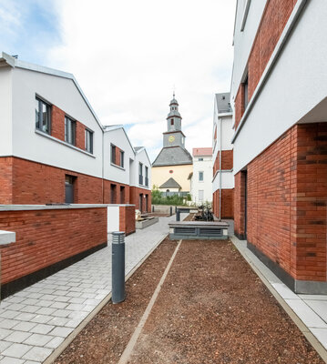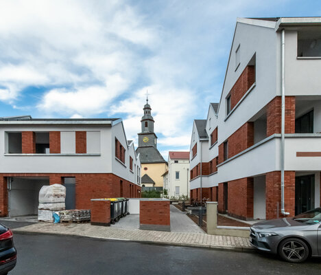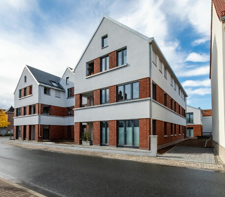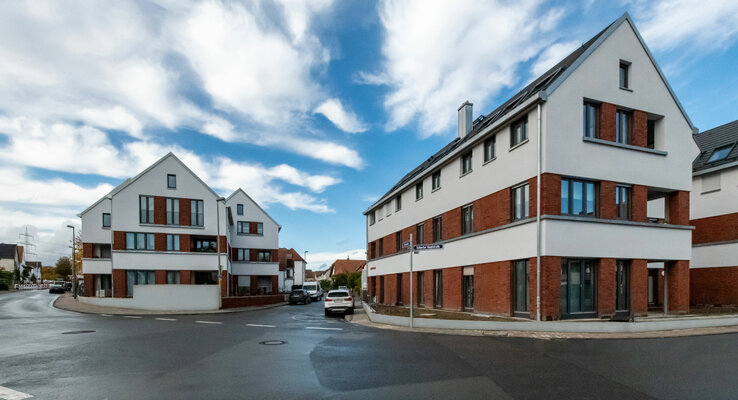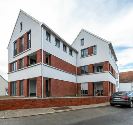 Der Frankfurter Stadtteil Kalbach ist durch das Nebeneinander von dörflicher Baustruktur und Neubauten der Sechziger- und Siebzigerjahre geprägt. Die Gruppe von drei Neubauten an einem markanten Kreuzungspunkt reagiert auf diese Situation: Die einzelnen Baukörper scheinen aus mehreren Einzelhäusern mit Satteldach zu bestehen, ihr Volumen wird ortstypisch gegliedert. Auch der rote Klinker und die hellen Putzflächen nehmen typische Elemente der Umgebung auf.