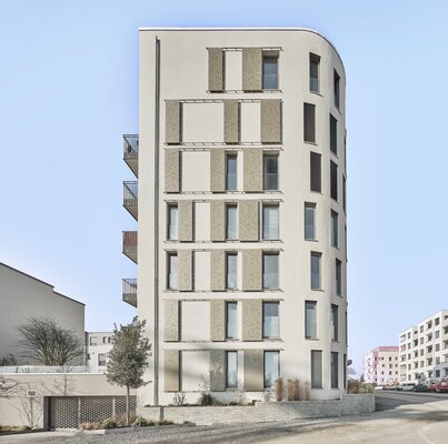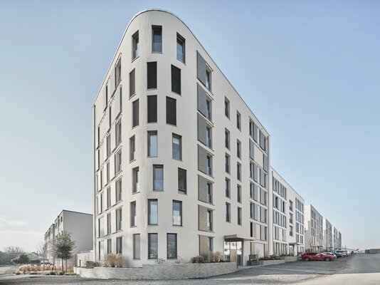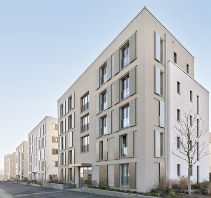 Gegenüber des künftigen Quartiersplatzes bildet ein siebengeschossiges Gebäude mit einer markanten Rundung den Hochpunkt. Die anschließenden fünf Gebäude folgen höhenversetzt entlang der ansteigenden Carl-Benz-Allee. Die Putzfassaden der reduzierten Kubaturen sind farblich in dezenten Greigetönen unterschieden. Wesentliches Gestaltungselement sind bodentiefe Fenster und gelochte Schiebeläden. Durch deren verschiedene Stellungen entsteht an den straßenseitigen Fassaden ein Wechselspiel.