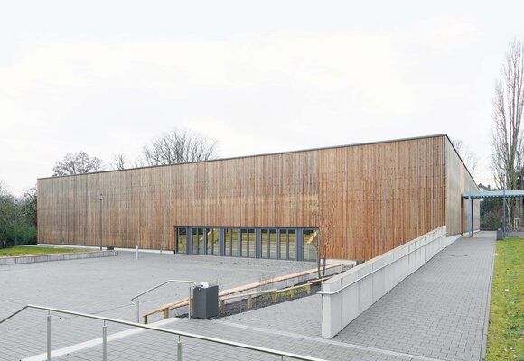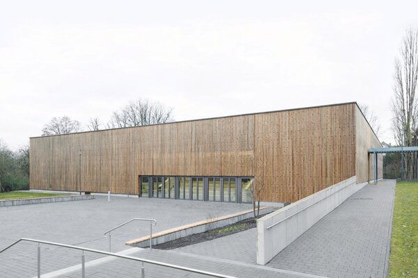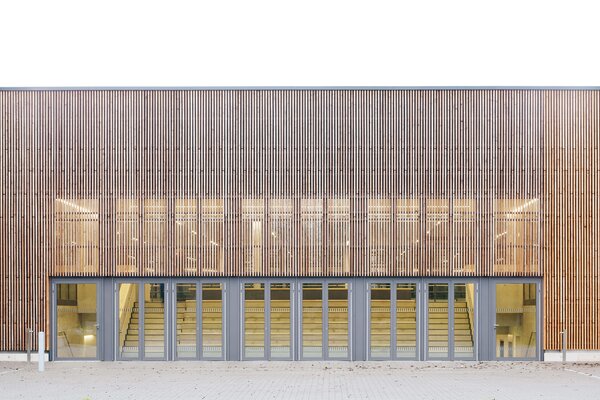 Die Dreifeld-Sporthalle der Hermann-Ehlers-Schule für Schul- und Vereinsnutzung schließt den Schulhof räumlich ab. Der Eingang orientiert sich an dem die Schulpavillons verbindenden überdachten Gang. Dem Geländeverlauf folgend sind Foyer, Tribüne, Teeküche und Kraftraum ebenerdig erreichbar. Eine Sitzstufenanlage mit Blick auf das Außensportfeld erschließt die im Untergeschoss liegenden Sportflächen, Umkleiden und Technikräume. Die Lärchenholz-Lattung der Fassade dient zugleich als Sonnenschutz. Alle nicht erdberührten Bauteile sind als Holzkonstruktion ausgeführt.