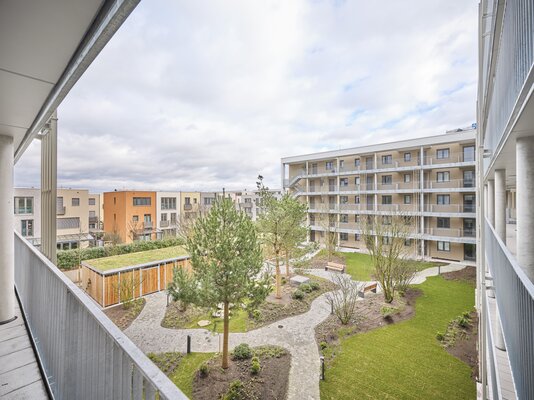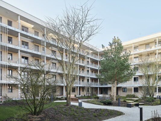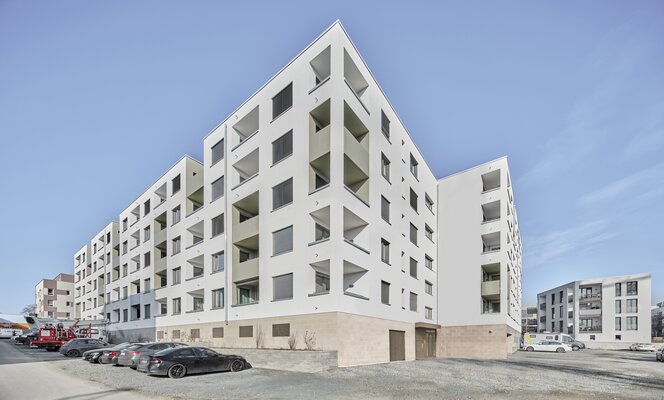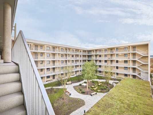 Die fünfgeschossige Bebauung umschließt 3-seitig einen intensiv begrünten Innenhof. Überbreite Laubengänge auf der Innenhofseite ermöglichen Lichtausschnitte, die Abstand zu den laubengangseitigen Zimmern schaffen und so die Privatsphäre verbessern. Vor den Wohnungseingängen ergeben sich Aufweitungen, die zu privaten Vorzonen werden. Um das Bauvolumen gestalterisch zu gliedern, wurde ein Teil der Loggien zwei- bis dreigeschossig farblich zusammengefasst und teilweise nach oben geöffnet.