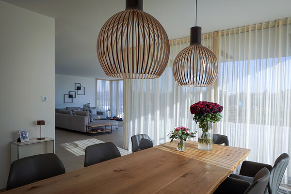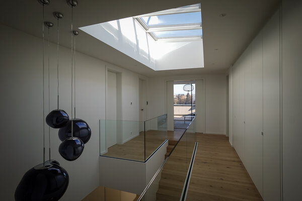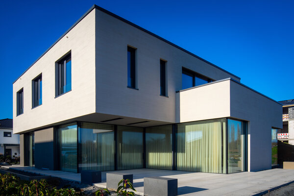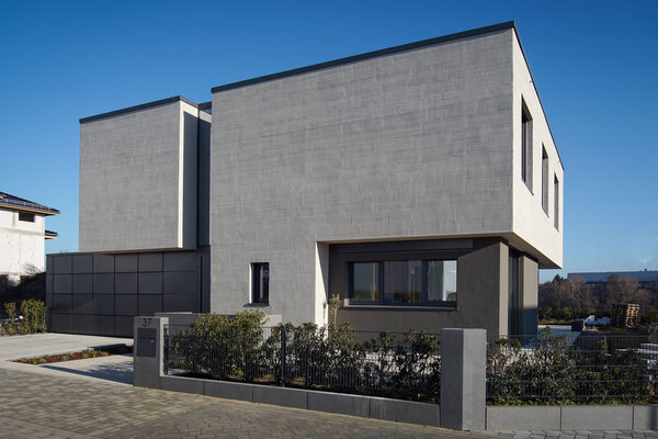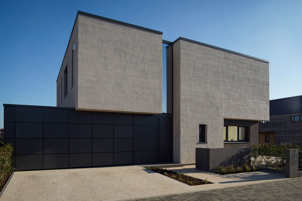 Kubisches Wohnhaus mit klarer Formensprache. Zur Straße hin geschlossen, öffnet sich die Fassade zum Garten hin mit großen Glasflächen und lässt fließende Übergänge entstehen. Spannende Raumerlebnisse kombiniert mit sorgfältig ausgewählten Materialien prägen das gesamte Innere. Offener Grundriss mit Wohn- und Essbereich im Erdgeschoss. Separate Schlafbereiche von Eltern und Kindern im Obergeschoss. Verbunden über eine elegante Treppe im zweigeschossigen Eingangsbereich mit Galerie und Oberlicht.